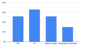 A significant majority (82%) of respondents reported subscribing to a newspaper or reading it elsewhere. 10% indicated they do not subscribe but read newspapers occasionally. Notably, no respondent reported never reading a newspaper. These findings suggest that newspapers continue to exert a strong influence on young people, with many developing a daily habit of reading them for detailed information.